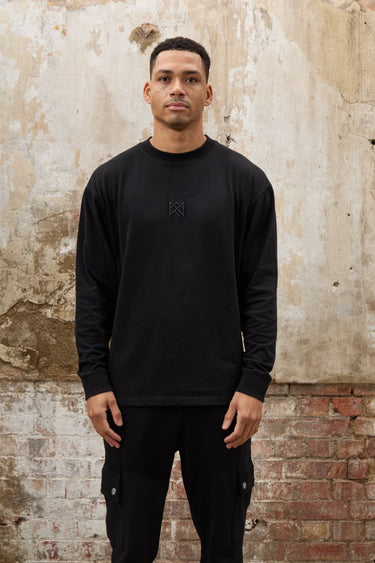 Confeccionada en punto de algodón 100% teñido en pieza de 240 g/m². Esta camiseta oversize de manga larga y cuello redondo en color negro presenta el logotipo de la marca bordado en 3D en el pecho y el nombre bordado en 2D en la espalda.